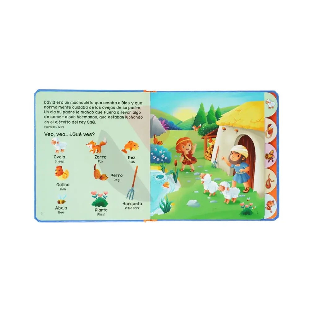 Cuenta con un formato accesible e interactivo, con divertidas ilustraciones e historias bíblicas sencillas. Además facilita el aprendizaje de vocabulario bilingüe Inglés-Español.